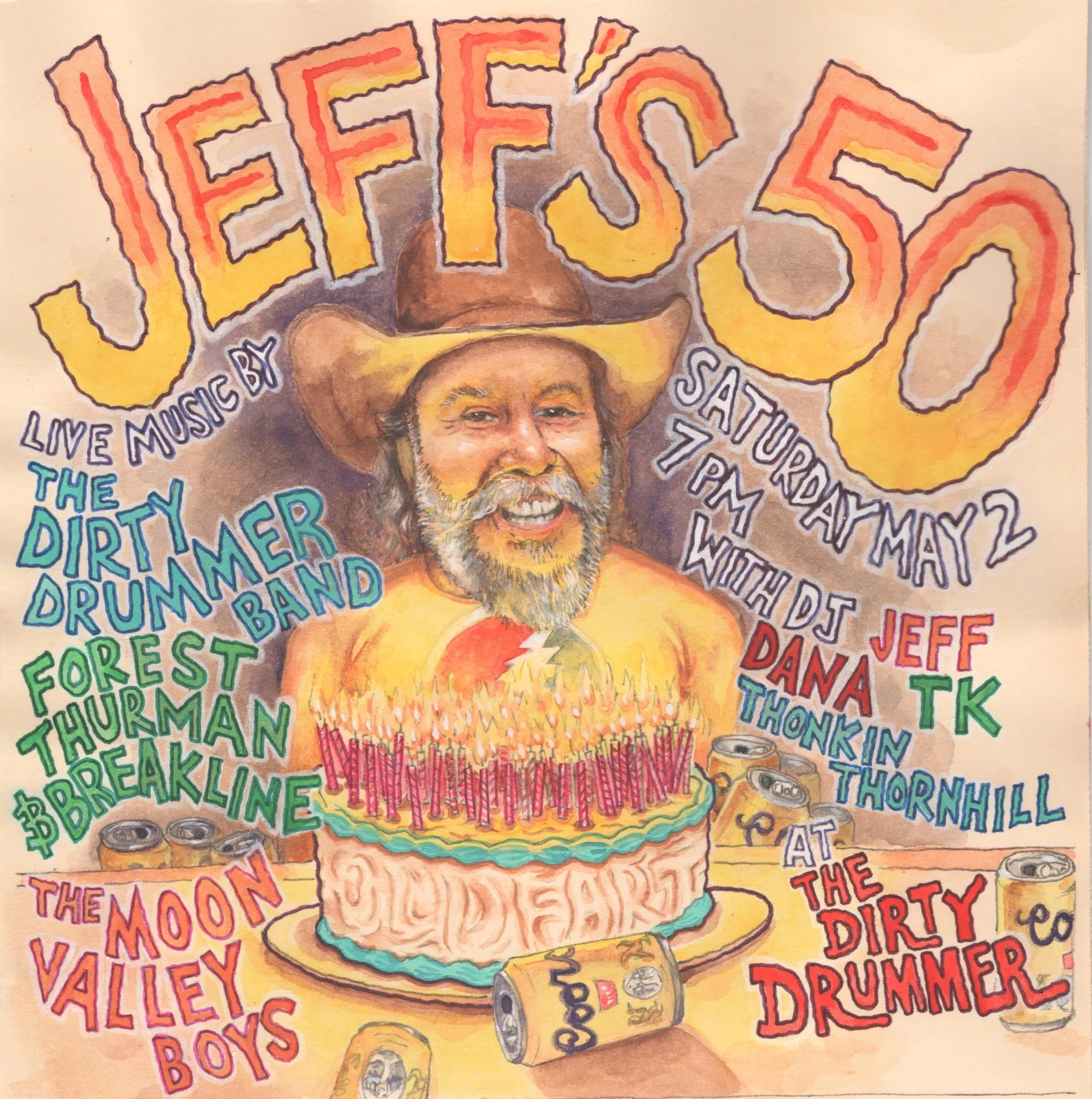Come celebrate a half century of Jeff with The Dirty Drummer Band, Forest Thurman & Breakline and The Moon Valley Boys + all vinyl deejays! Festivities begin at 7pm sharp. NO COVER!