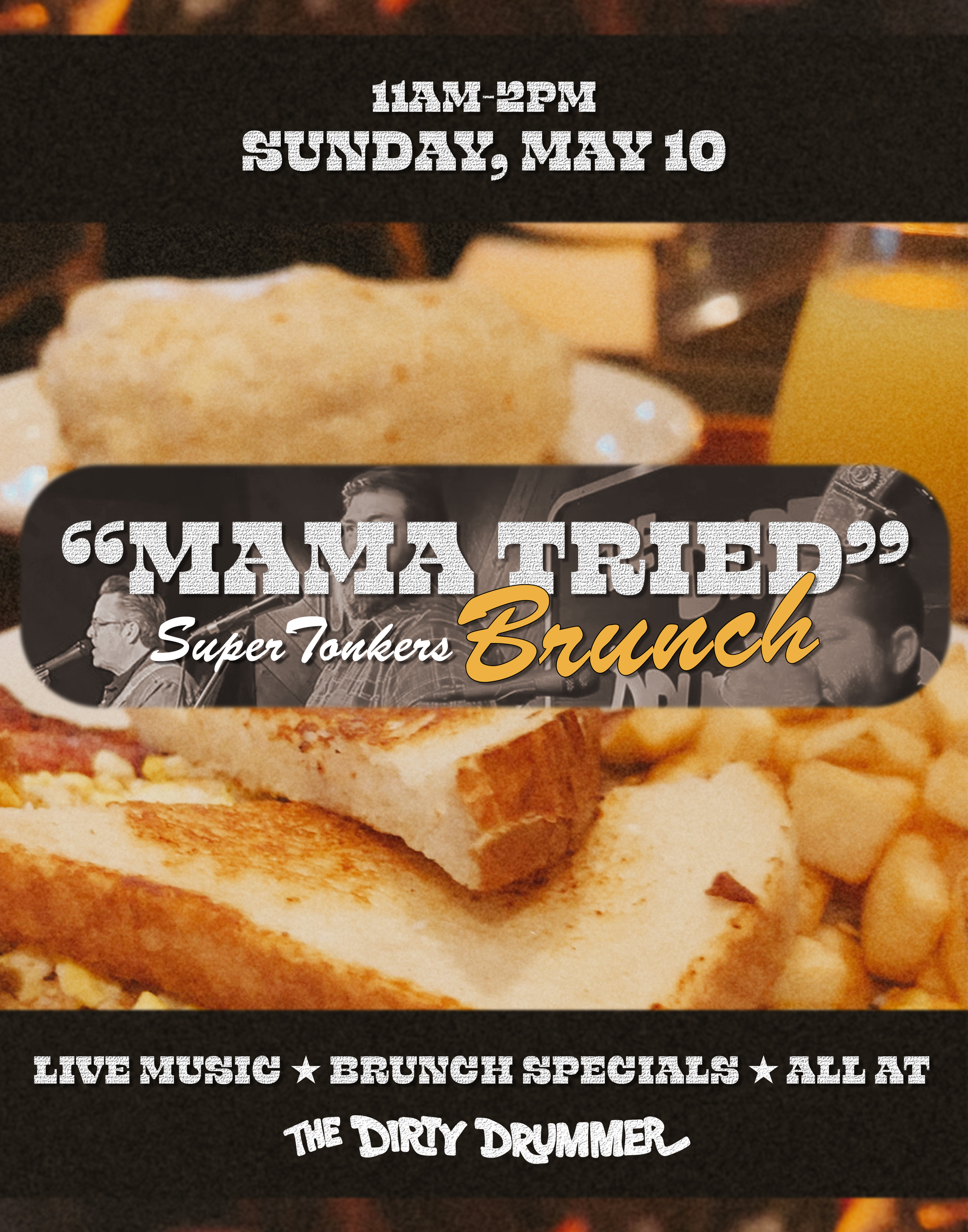 Dirty Drummer Brunch with live music from The Supertonkers! Special Brunch Menu and Breakfast Cocktails! Join us on Sunday, May 10, at 11am.
