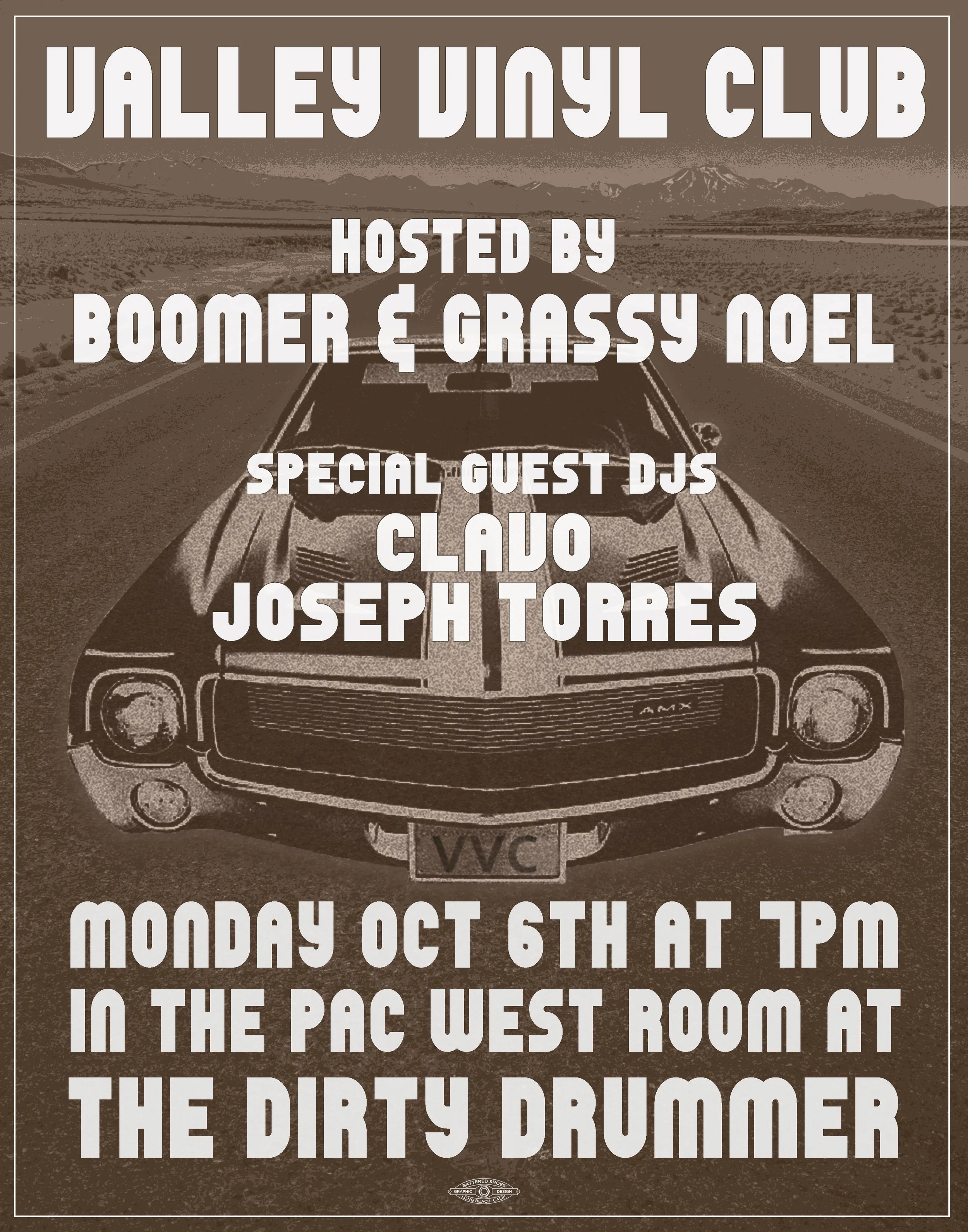 VALLEY VINYL CLUB all vinyl DJ night Monday, October 6, 2025 7:00 PM 11:00 PM 19:00 23:00 The Dirty Drummer 2303 North 44th Street Phoenix, AZ, 85008 United States (map) Google Calendar ICS VALLEY VINYL CLUB:HOST DJS BOOMER AND GRASSY NOEL WITH GUEST DJs Clavo & Joseph Torres!